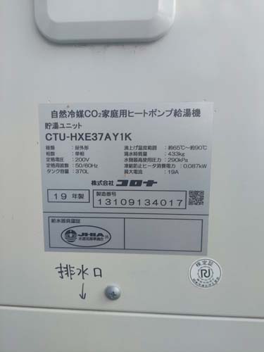 五城目町 コロナ自然冷媒CO2家庭用ヒートポンプ給湯機貯蓄ユニットCTU-HXE37AY1K エコキュート交換工事