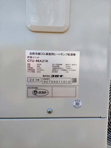 大仙市 コロナエコキュート→コロナ自然冷媒CO2家庭用ヒートポンプ給湯機貯湯ユニットCTU-46AZ1K エコキュート交換工事
